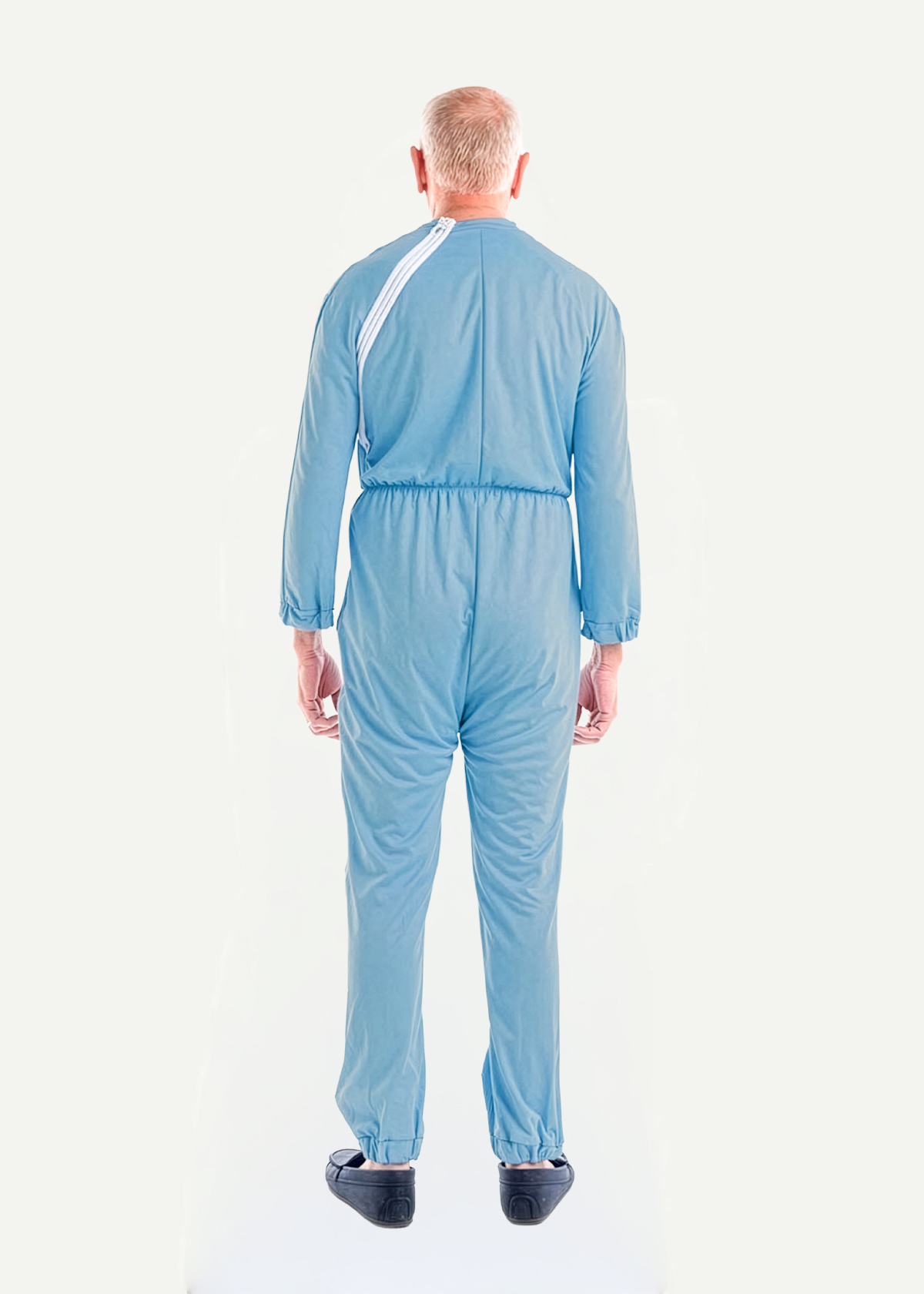 These pyjamas are designed to enable carers to dress and undress a person from a lying position, and are suitable for people who have a tendency to disrobe inappropriately and for avoiding picking and smearing behaviour. They also allow easy and quick access for toileting.