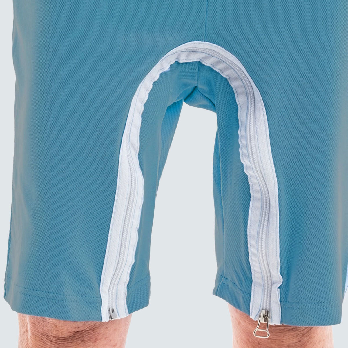 Short legs and short sleeves. The zip goes from the shoulders to the side seam and between the legs. The zips are placed on the outside of the garment.